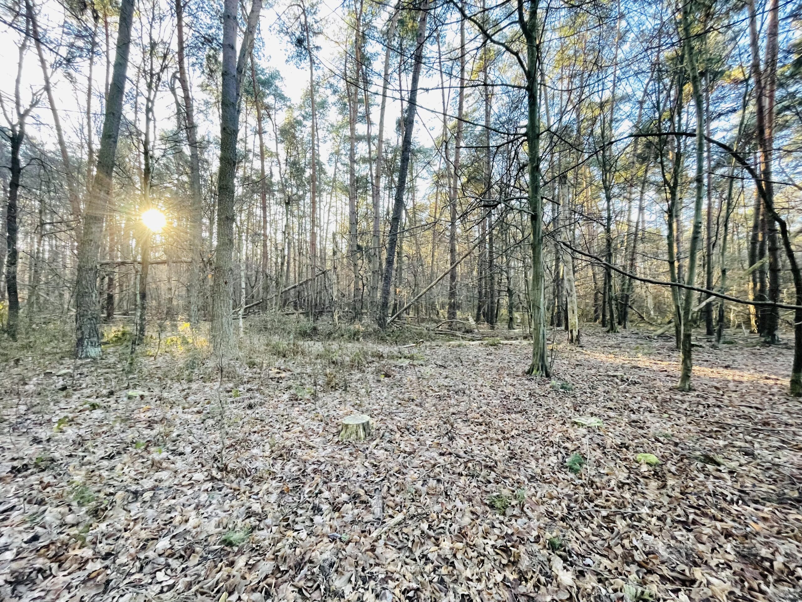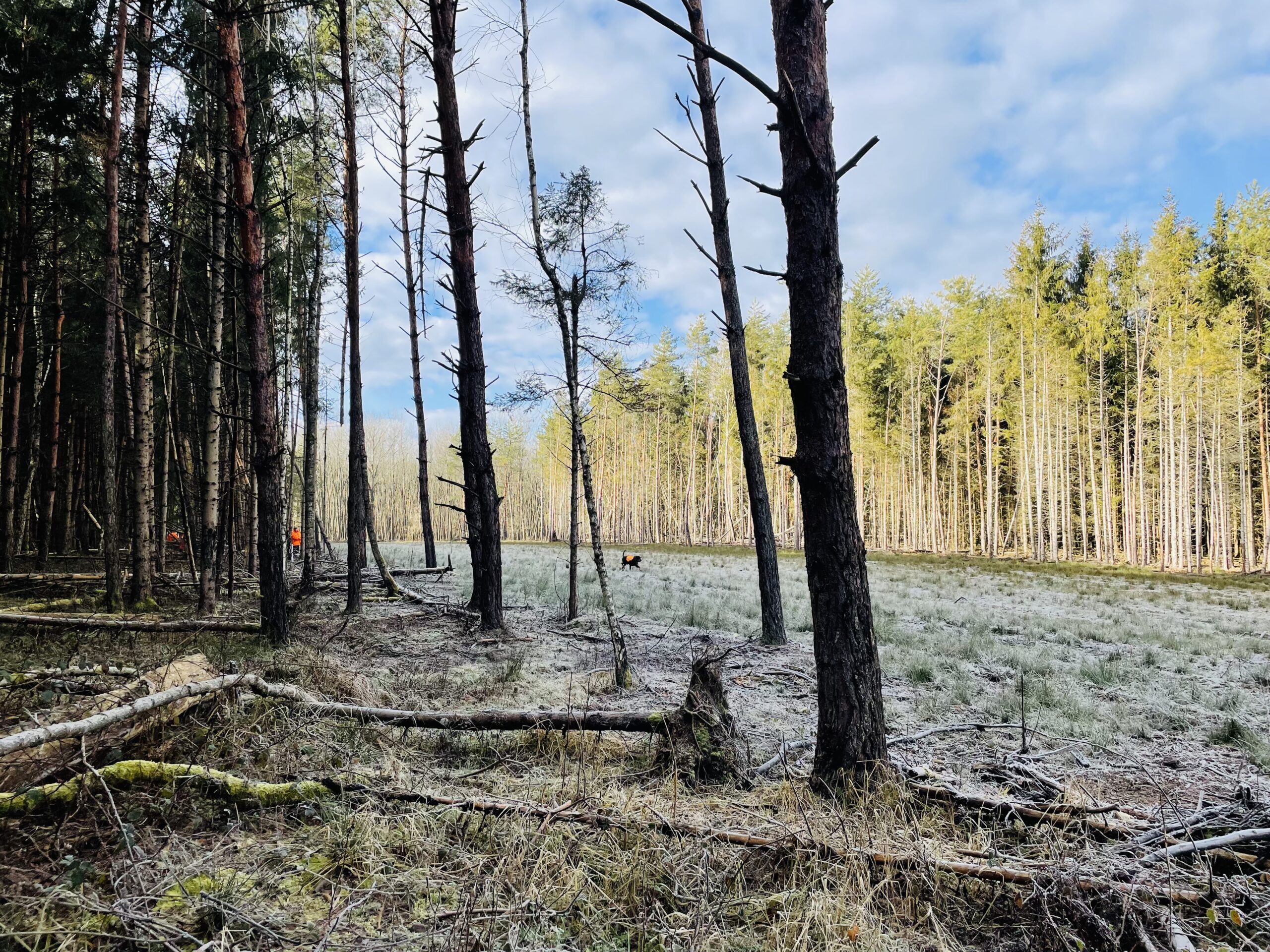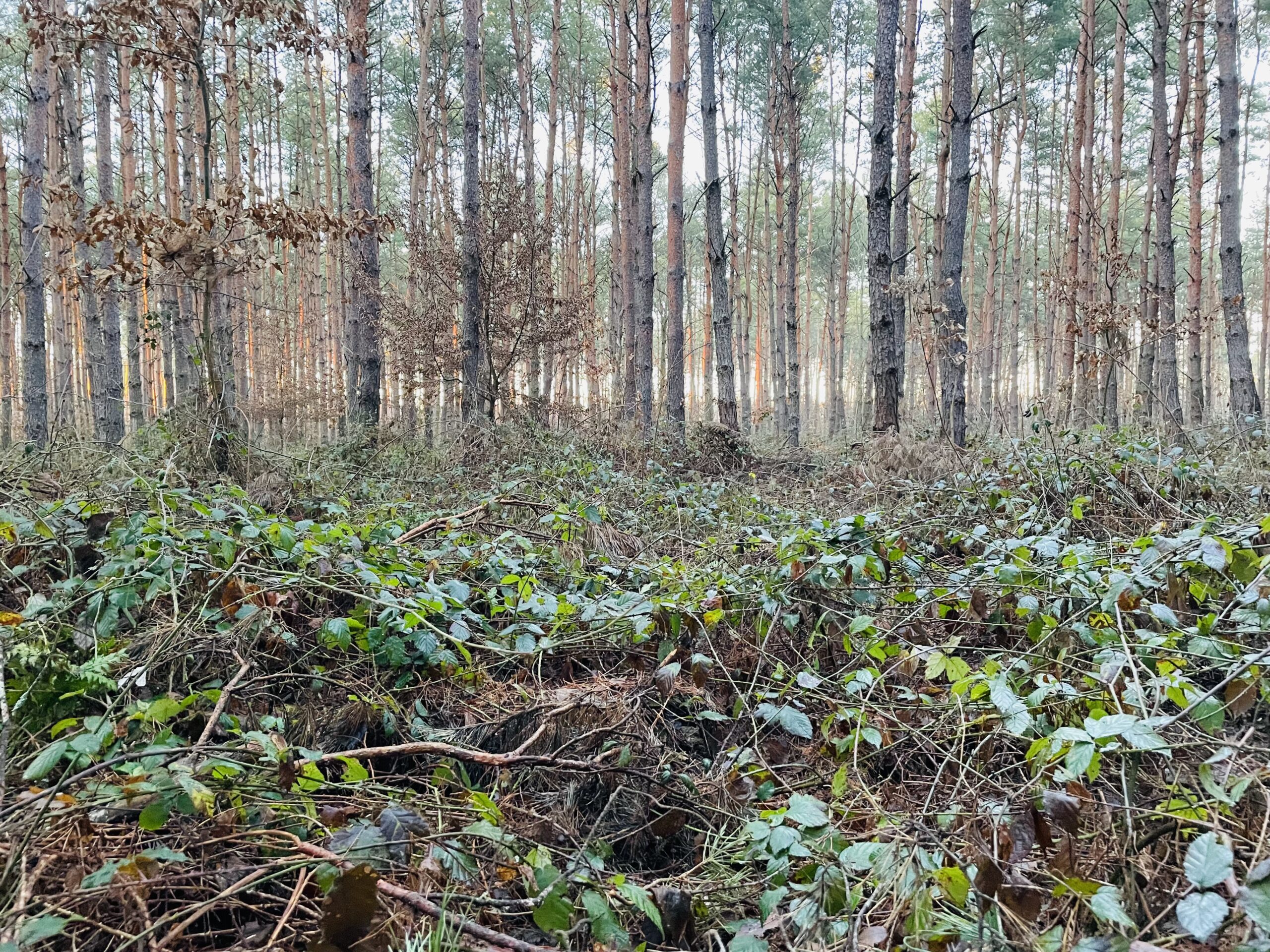 A terep domborzati szempontból igazán könnyű, a haladást ugyan nehezíti szederindával borított talaj de szép fenyves, lombhullató szálerdő és vadföld váltja egymást, több széles nyiladékkal és „villanysávval”. Az első hajtásnak dél körül van vége, továbbra is szerencsés, szép napos időnk van, ez jól jön a mínuszos hidegben.