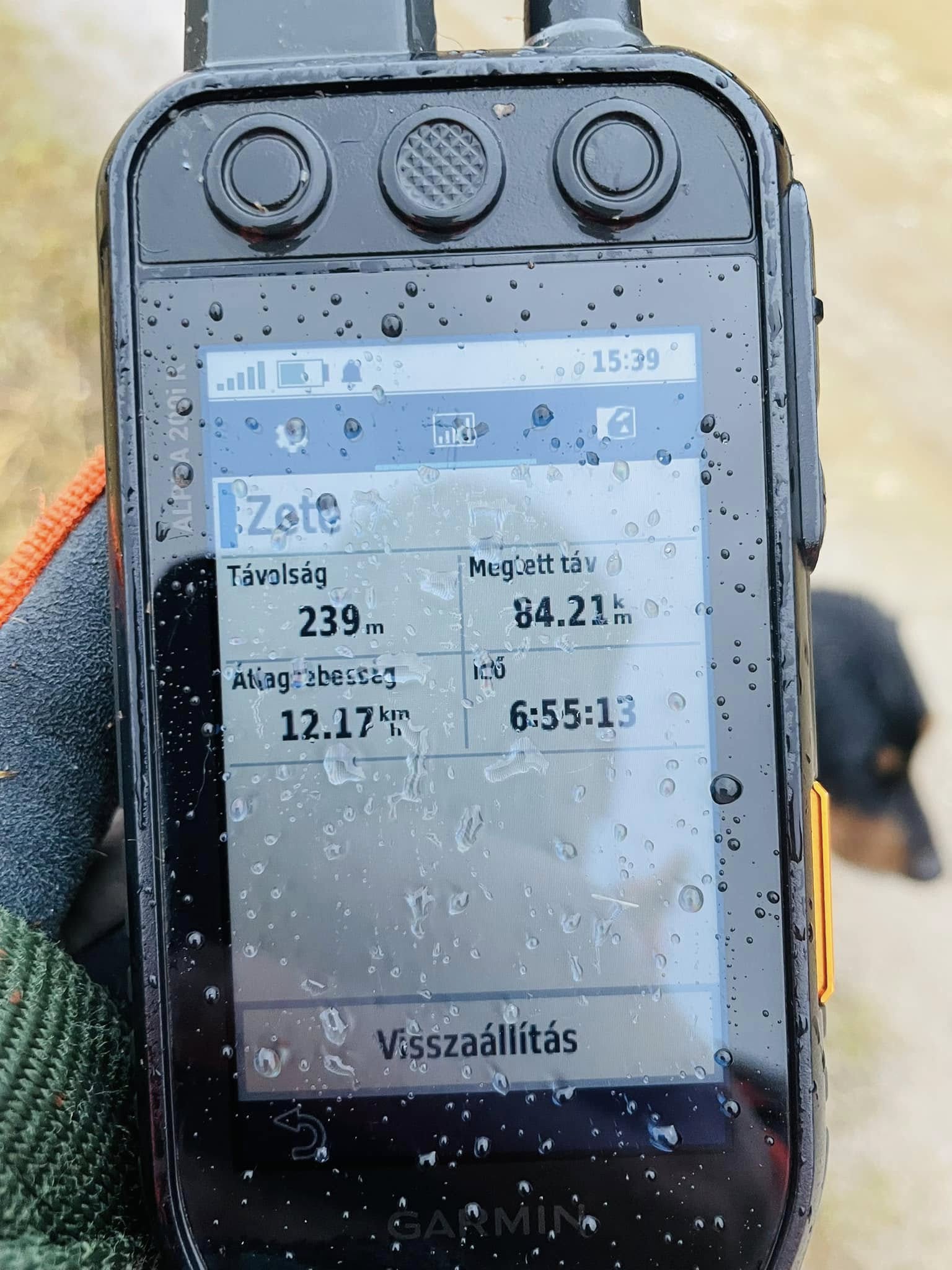 Nagyon örültünk, hogy a máskor itt-ott tapasztalt jelkimaradás most szórványosan sem jelentkezett és végig kifogástalanul működtek a Garminos jeladóink. Emiatt már a délelőtti hajtás közben látszódott, hogy ma igazán nagyot mennek a „fiúk”. Elsőként Cohárd lépte át a húsz kilométeres távot, utána viszont a többiek is egyre jobban belehúztak. A nap végére mindhárom kopónk rekordot állított fel: Cohárd 51 km-t, Dongó 59 km-t hozott össze. A legmeglepőbb azonban Zete munkája volt, aki a hajtás végére 76 km-t (!) nyargalt össze. Nem akartunk hinni a szemünknek! (Összesen 8,5 km-t vittek a három átálláskor mikrobusszal). Este az egyik vadász szerint az az érzésük volt, hogy „ez a kopó szinte ott van mindenhol”.