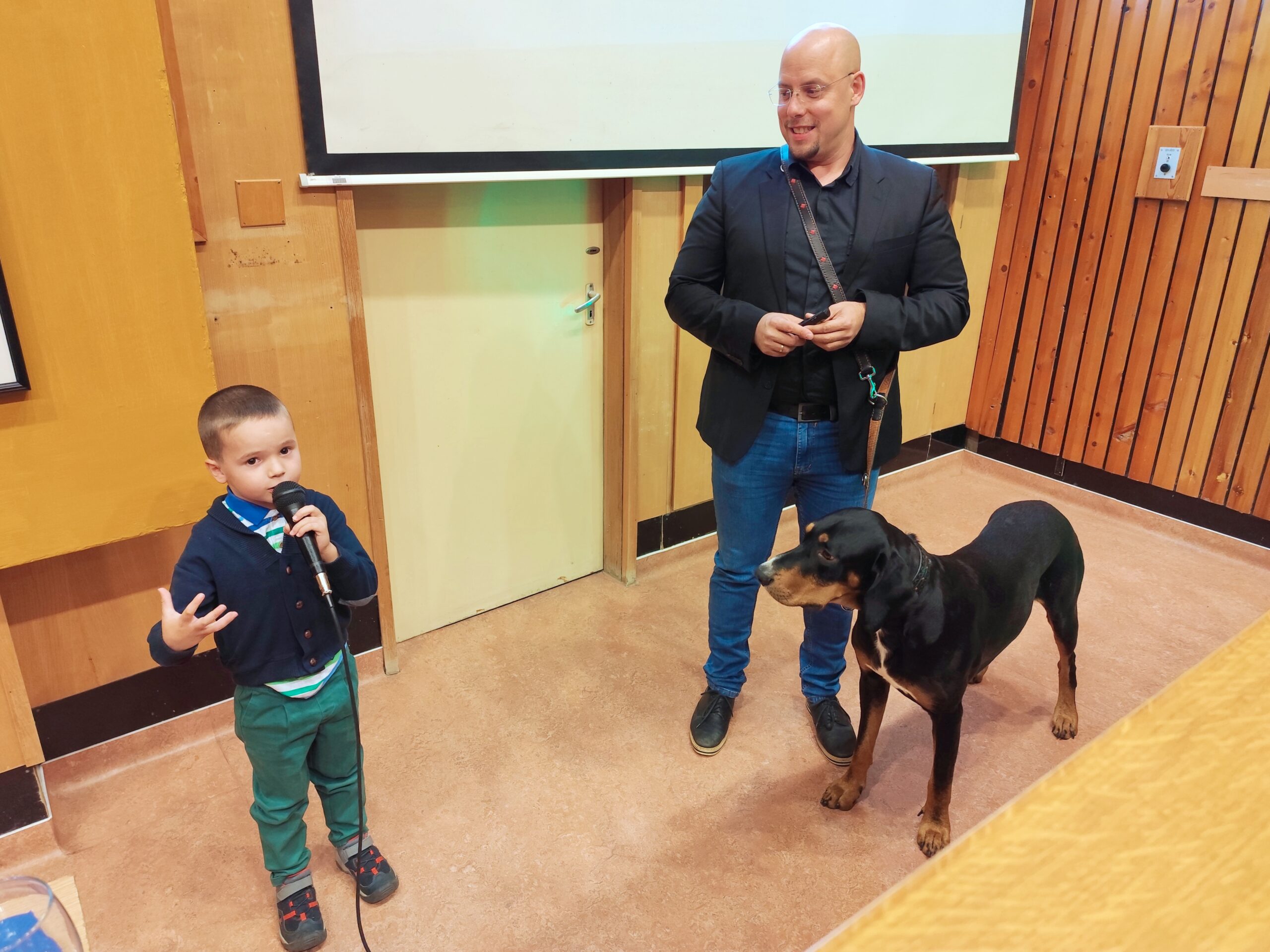 Szeptember 26., Gyöngyös: A Kutatók Éjszakáján a Magyar Agrár- és Élettudományi Egyetem Károly Róbert Campusán mutathattuk be fajtánkat. Bár kis létszámú, de rendkívül lelkes hallgatóság gyűlt össze. Lázár sem akart kimaradni az eseményből, így velünk tartott, és ő mesélte el a „kopómesét”. A közönséget elvarázsolta a sármjával, így végül nagy sikert aratott. Számunkra különleges élmény volt a modern, lépcsőzetes előadóban bemutatkozni. Hálás köszönet a meghívásért Burunkai Patríciának, akinek neve sokak számára ismerősen cseng a kutyás kiállítások világában is!