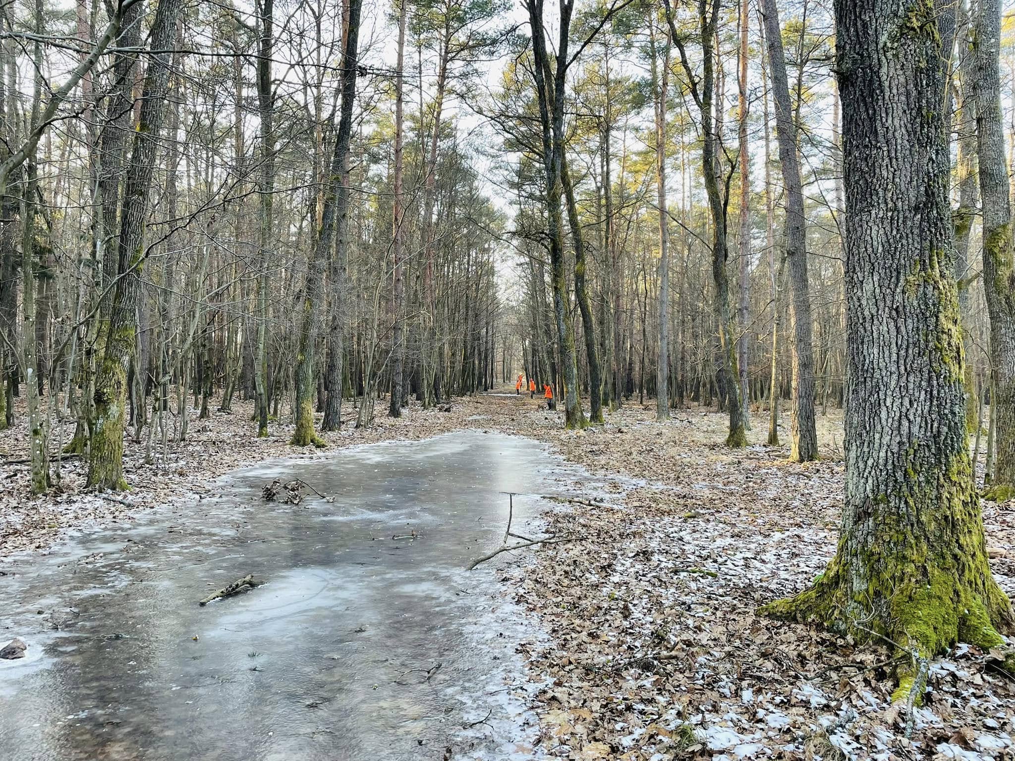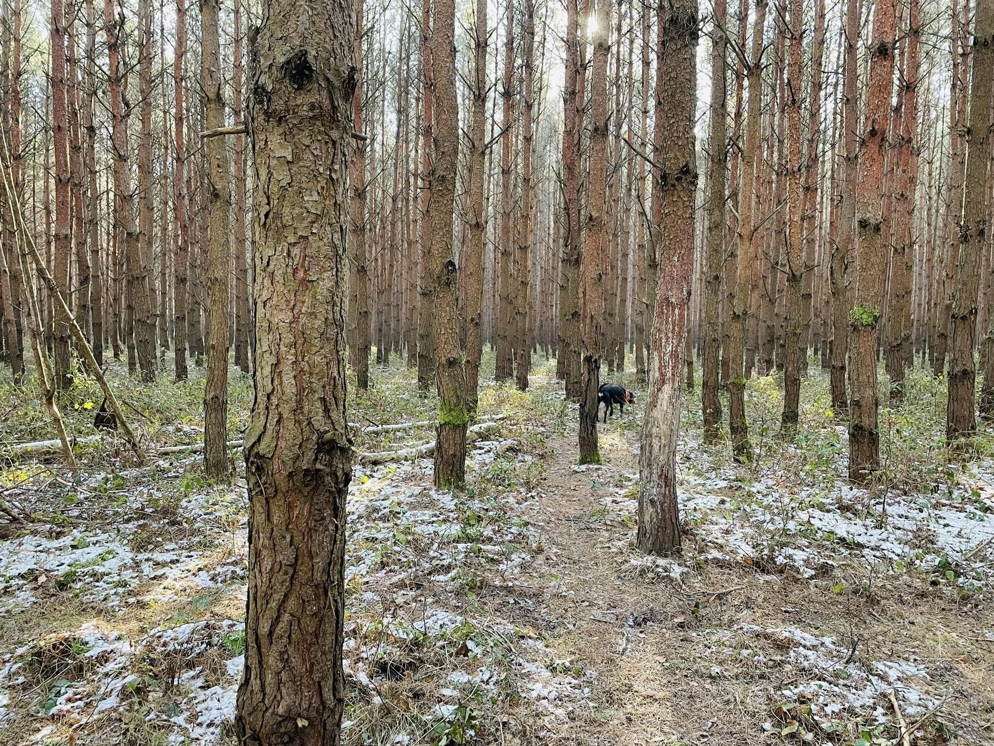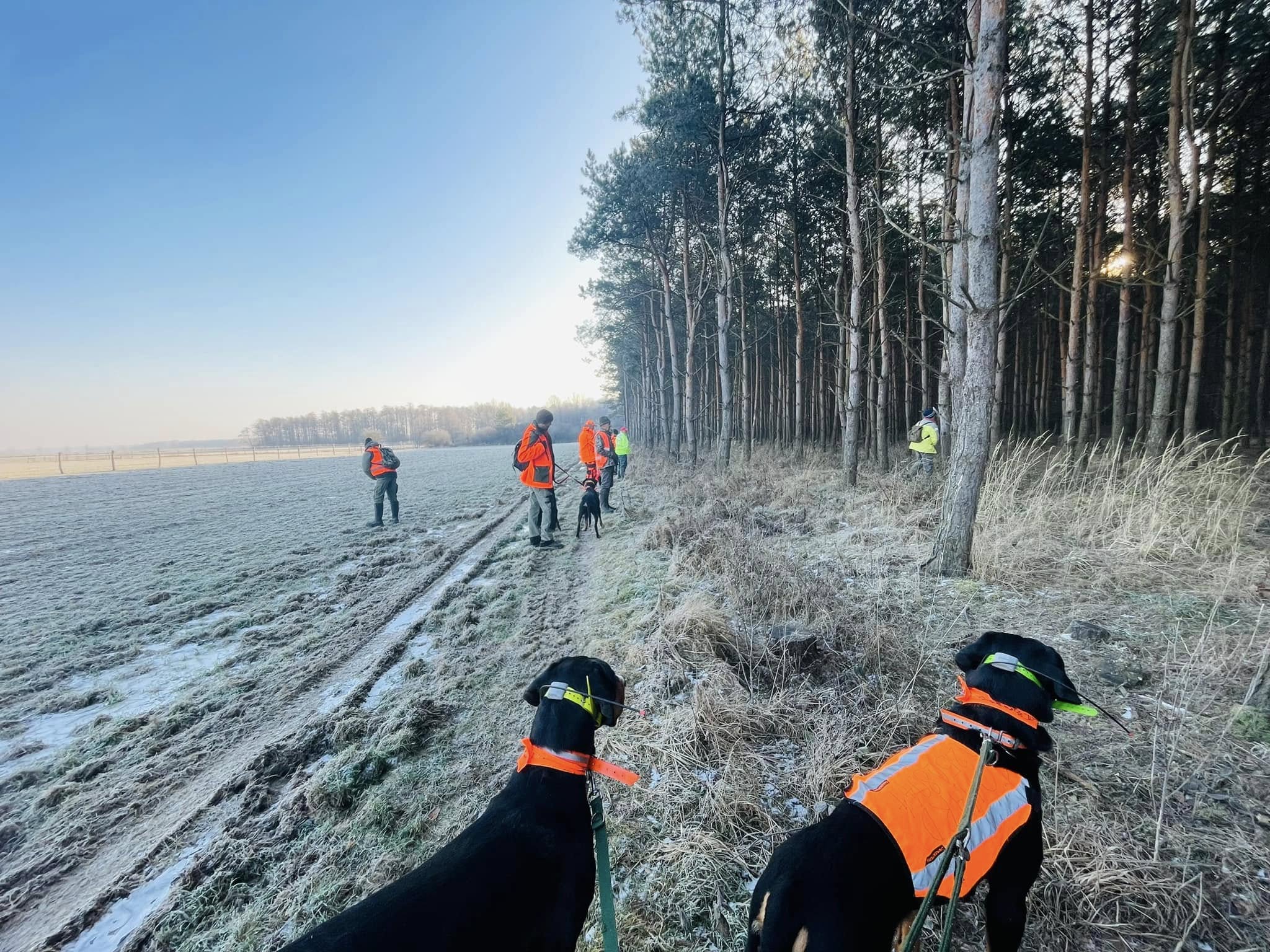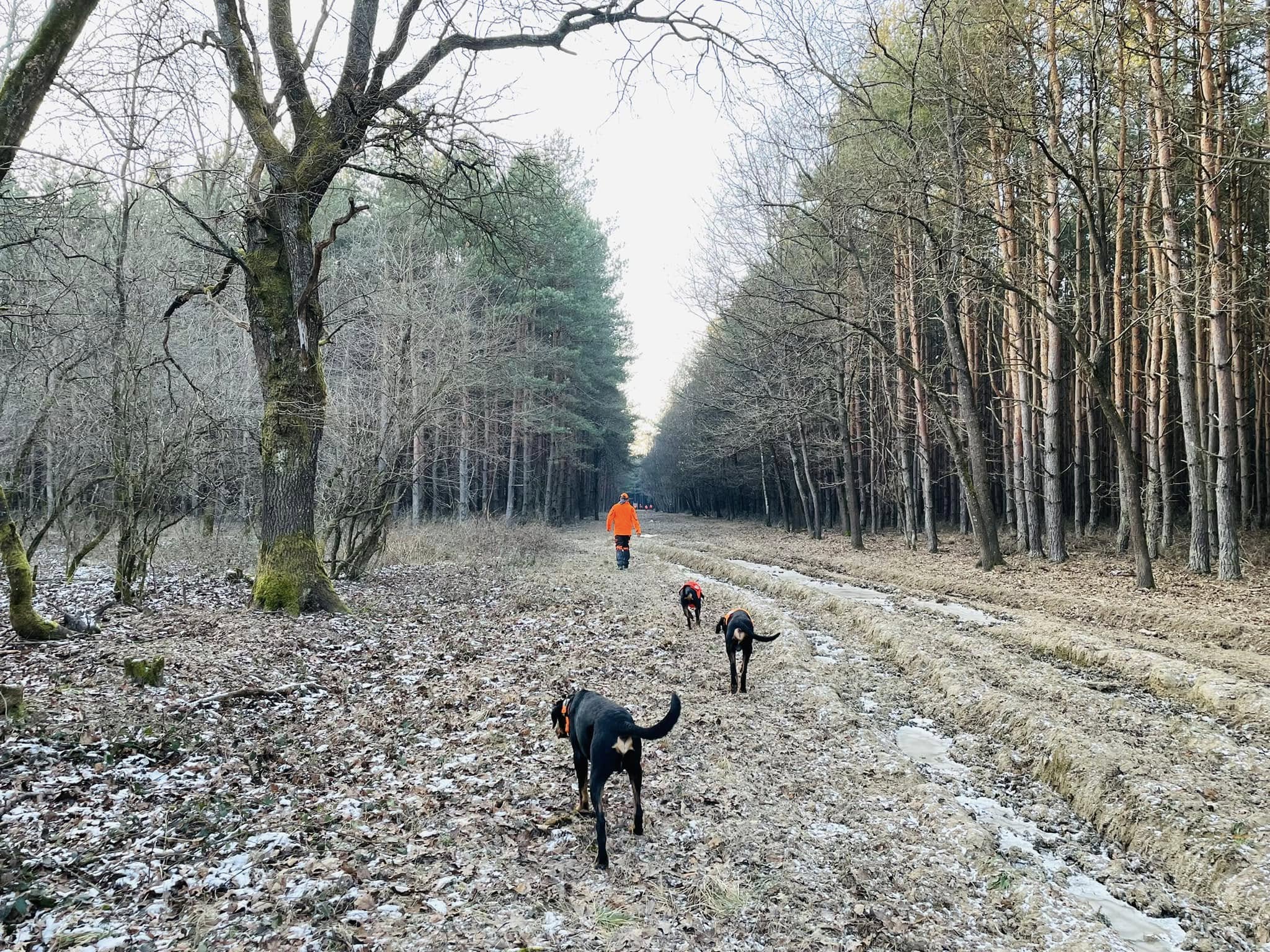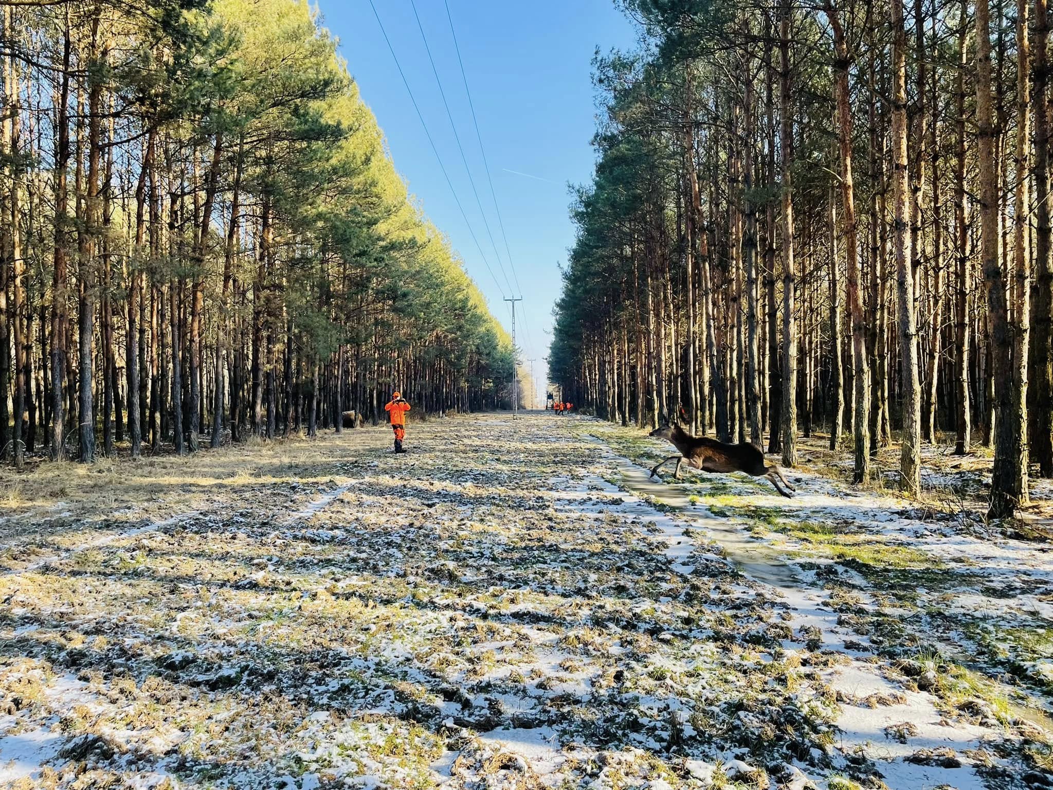 Az idő alkalomhoz kiválónak ígérkezett. A korareggeli fél nyolcas gyülekezőkör – 9 fok volt, ez csökkent délutánra fokozatosan – 1, – 2 fok körülire. Erre a napra három hajtás volt tervezve, amelyekből az első kettő volt igazán hosszú. Végig szinte sík terepen haladtunk, leginkább még megmaradt hóval és jéggel borított erdei fenyőerdőben és tölgyesben, ahol volt annyi takarás, hogy a vad megbújjon (így szarvast és vaddisznót is többször láthattunk), de bőven volt lehetősége és területe a kopóknak is nyargalni. Az elmúlt évekből a terület ismerős volt – az is, hogy már a hajtás előtt szólni kezdtek a puskák.